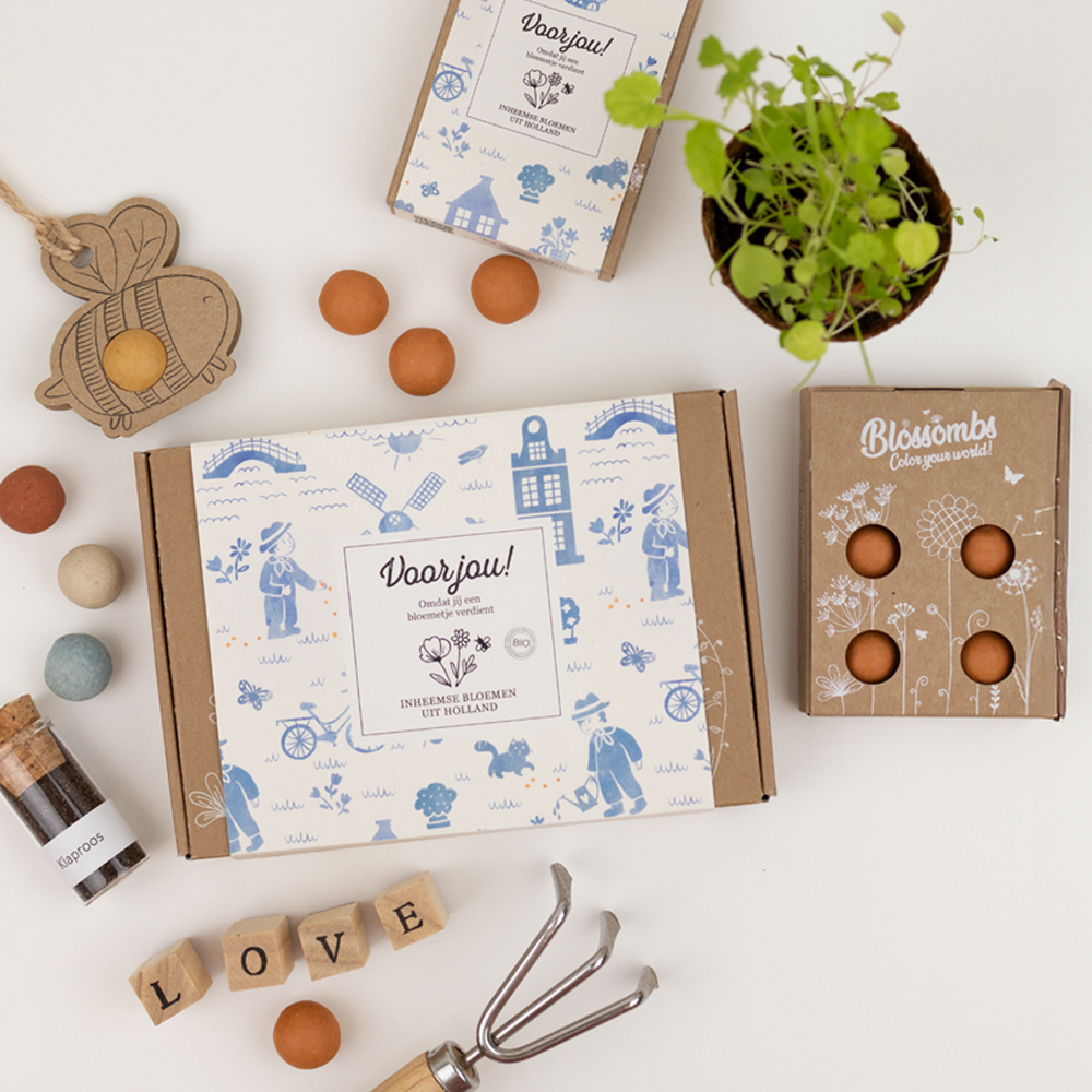 - De Blossomb: Blossombs zaadbommetjes zijn biologisch en bestaan dus uit 100% natuurlijke ingrediënten. Ze zijn gevuld met biologische zaden, vezels en klei. Het mooie kleurtje komt van natuurlijk pigment.