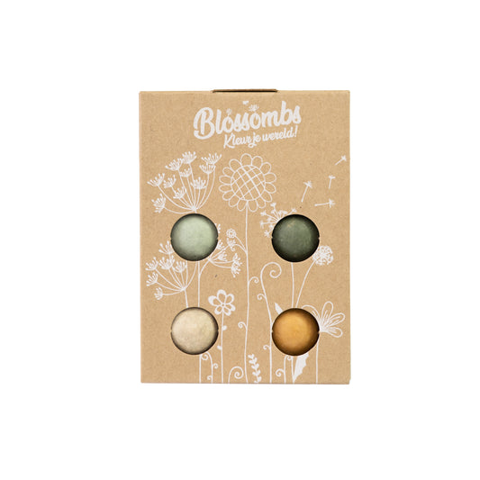 Met de kleurrijke zaadbommetjes van Blossombs creëer je een bloemenzee en voedselparadijs voor bijen en vlinders. Verspreid de Blossombs buiten, zoals in je tuin, op een braakliggend stukje grond, langs een kale berm of in een pot op je balkon (maar vermijd natuurgebieden). Wacht op regen (of gebruik een gieter), heb even geduld en geniet vervolgens samen met de bijen en vlinders van de prachtige bloemen!
