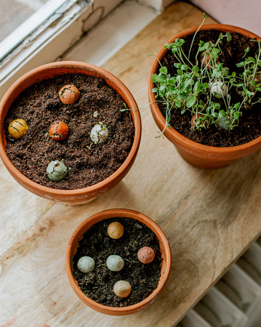 Gemaakt in Nederland met biologische, wilde bloemzaden en natuurlijke klei, nutriënten en kleurpigmenten.