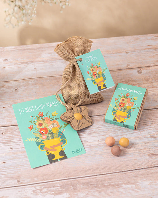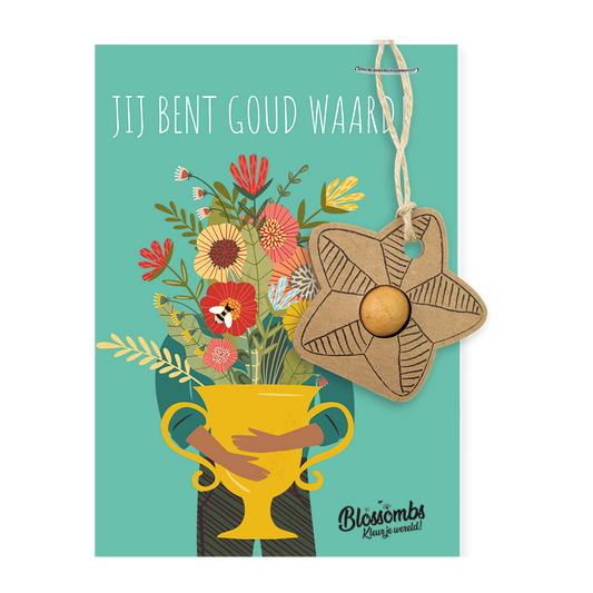 Kaart "Jij bent goud waard" met sterhanger en bloembommetje