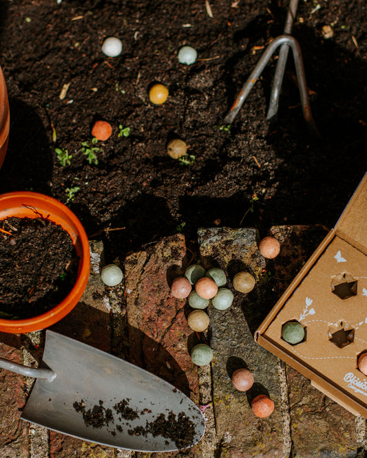 A fun gift egg box with 6 colorful Blossombs. Blossombs' brightly colored seed bombs create a veritable sea of flowers and food paradise for bees and butterflies.