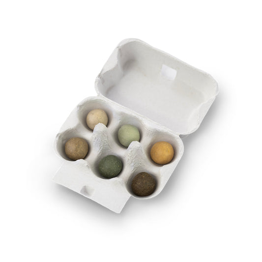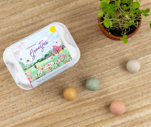 Ons eierdoosje is een stuk duurzamer dan een gewoon eierdoosje! Zo is ons eierdoosje gemaakt van FSC gecertificeerd karton en is het samengesteld door onze collega's van de sociale dagbesteding. Het eierdoosje is gevuld met 6 Blossombs van verschillende kleuren. Let op, het eierdoosje past niet door de brievenbus en is dus extra leuk om persoonlijk aan iemand te geven.